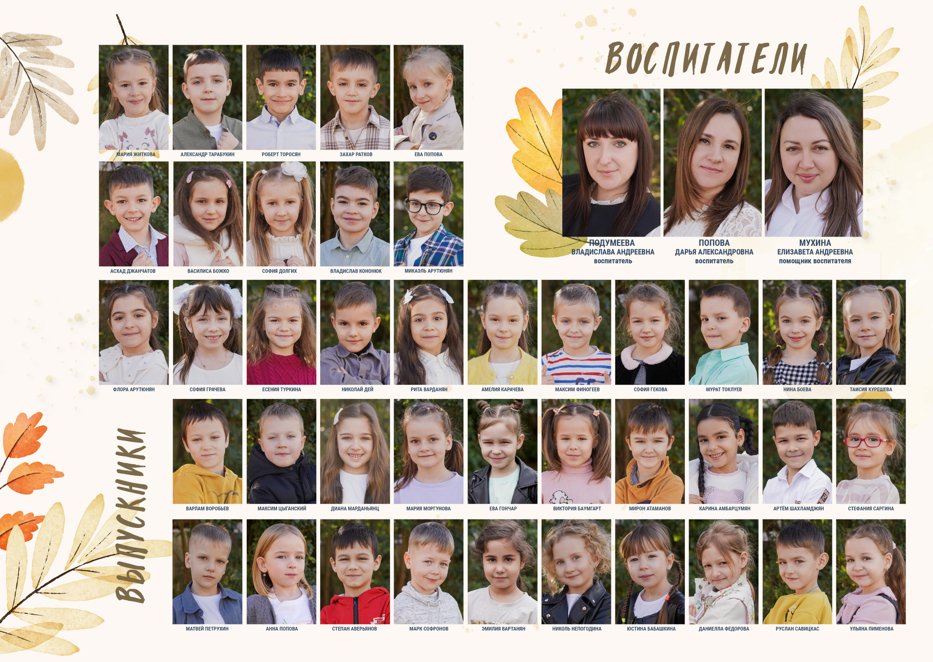 - портреты всех ребят в группе с именами и фамилиями;